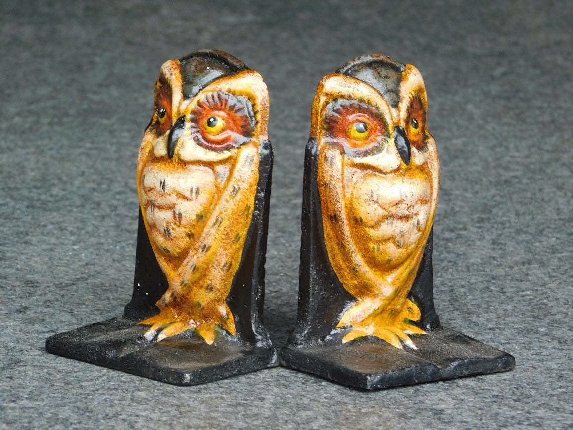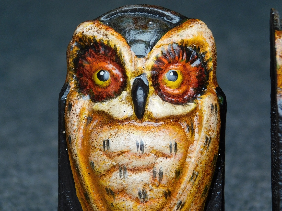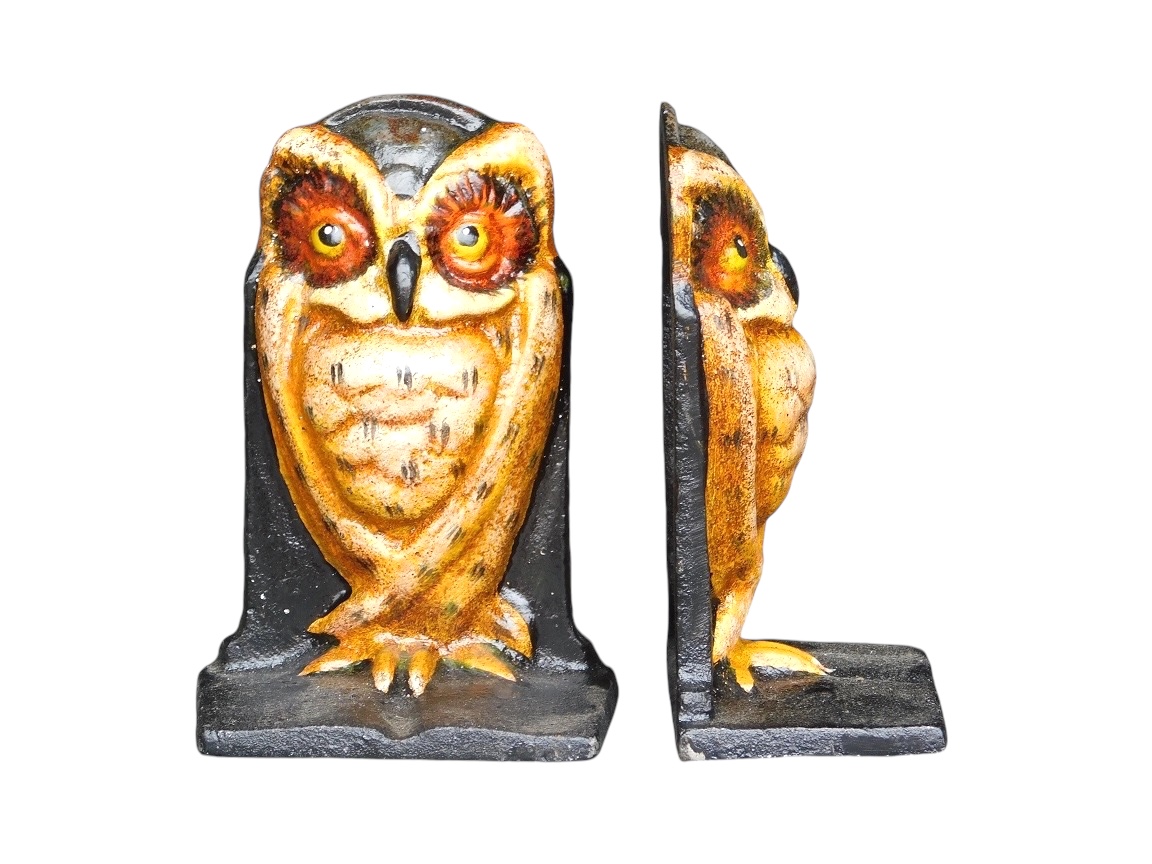 Leuke set van twee boekensteunen als Uil, volledig in kleur en gemaakt van gietijzer!