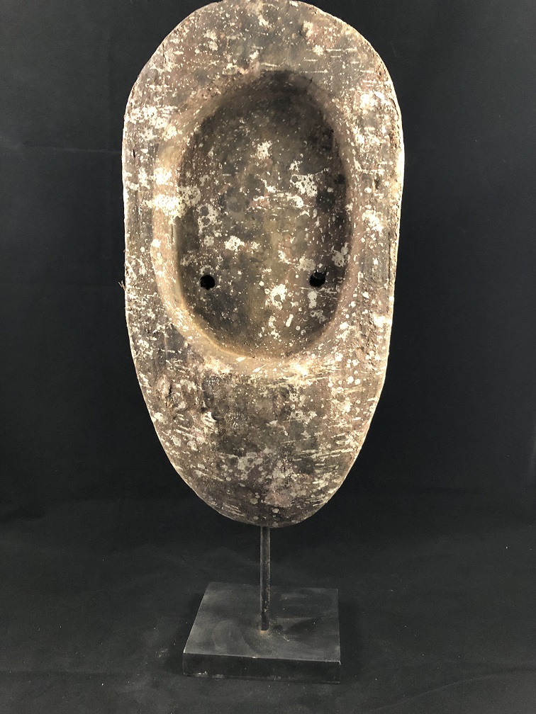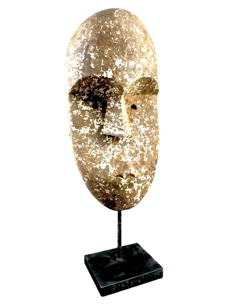 Dit is een handgemaakt masker van hout op een metalen statief, zeer fraai en toch ook uniek om te zien.