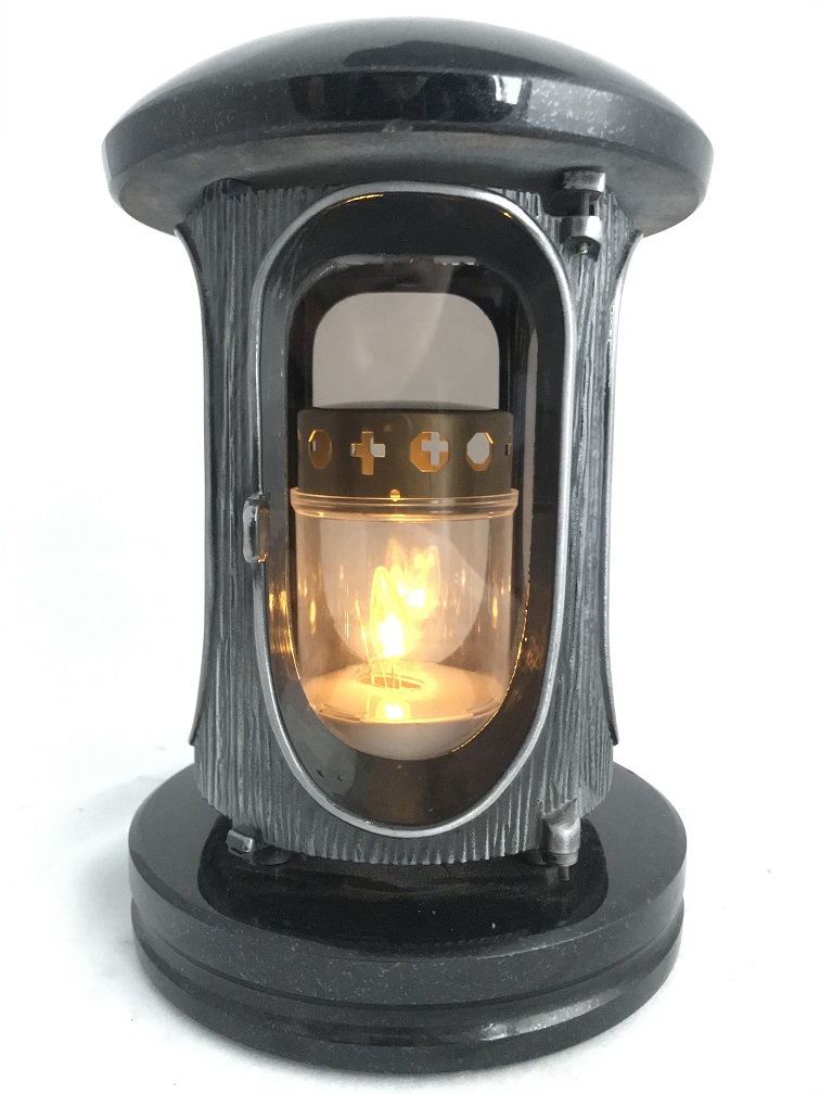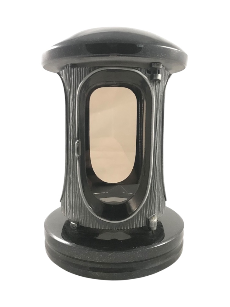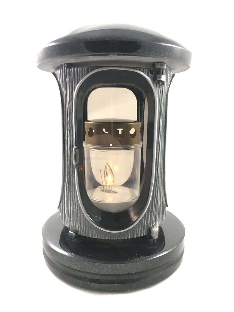 De graflamp is gemaakt van graniet en heeft een fraai decoratief huis.