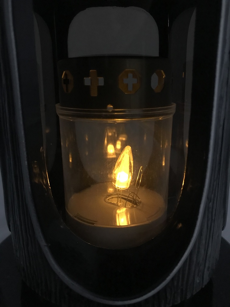 U kunt bij deze graflamp ook een lichtje (zie foto 6, 7 en 8) krijgen, die precies in de lantaarn past. Dit is ook een fraai lampje die de lantaarn extra tot haar recht laat komen (dit lampje brandt circa 50 dagen). Ook hier kunt u voor kiezen in het menu die bij de prijs staat.