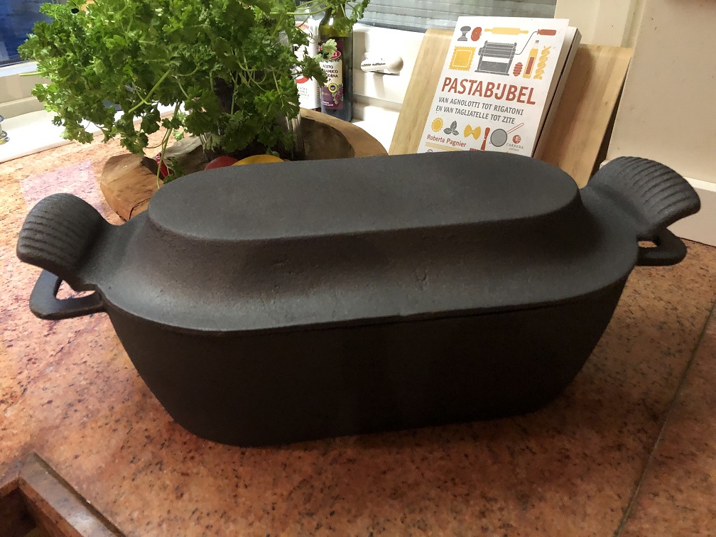 Zeer zwaar en robuust en kan ook nog zo boven het vuur worden gebruikt en kan zo vol in de oven.