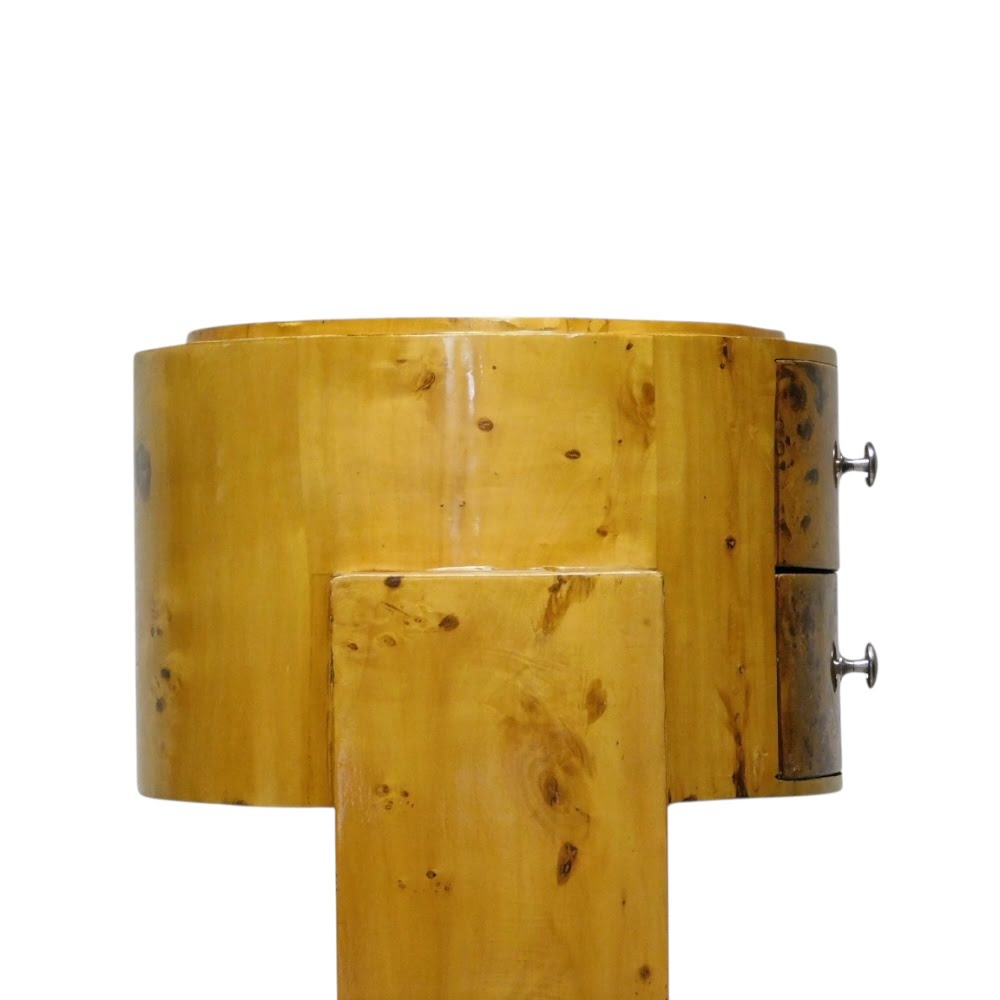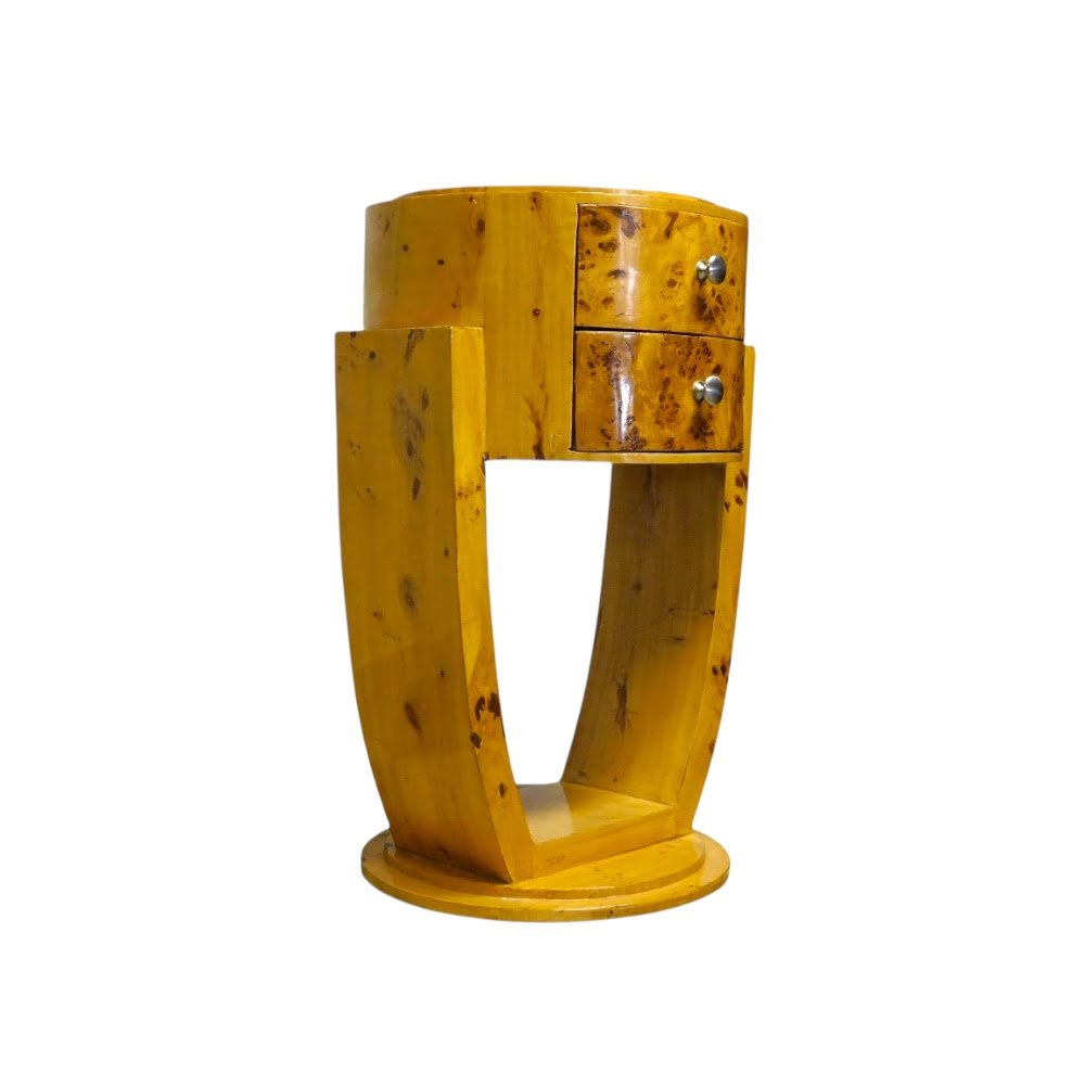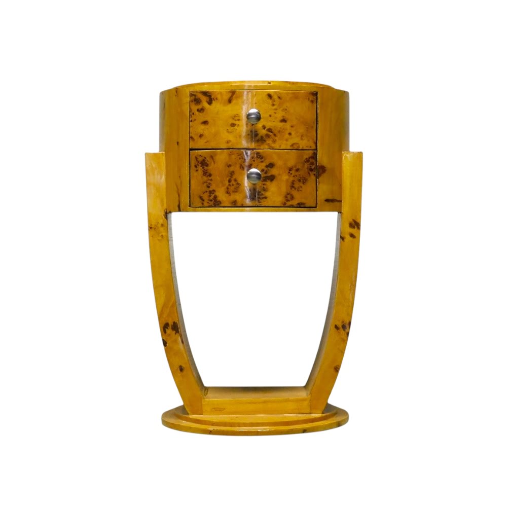 Het kastje is vervaardigd uit hout en voorzien van twee praktische lades, wat zorgt voor een functionele en decoratieve toepassing. De combinatie van de gebogen lijnen en het warme hout geeft het meubel een tijdloos en stijlvol karakter.