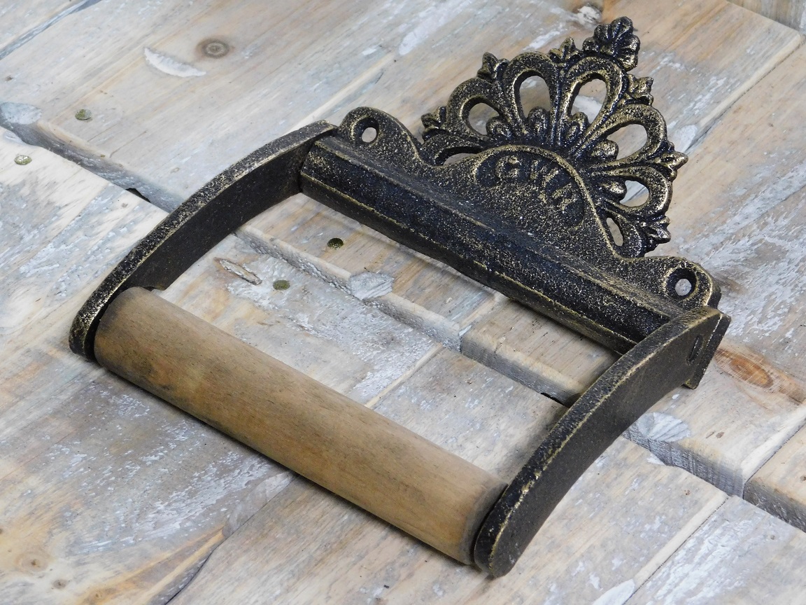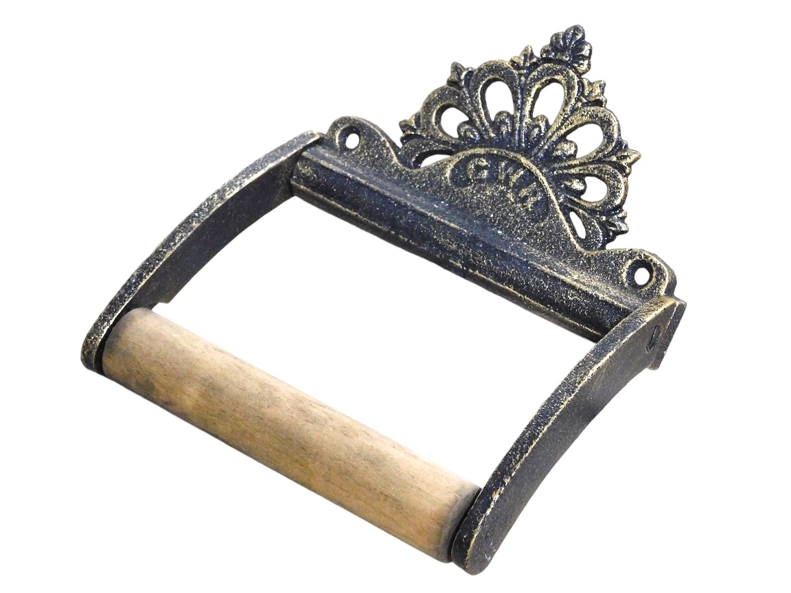 Toiletrolhouder, gepatineerd messing en hout, GWR