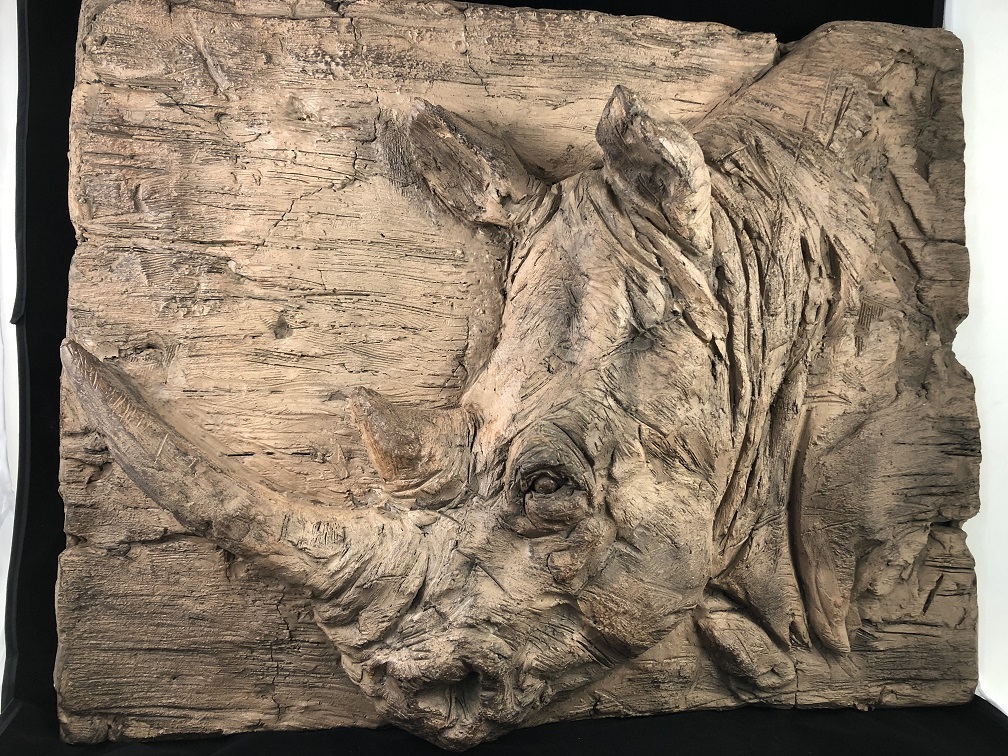 Prachtig wandornament met 3 D afbeelding van neushoorn, geheel in wood look uitgevoerd.