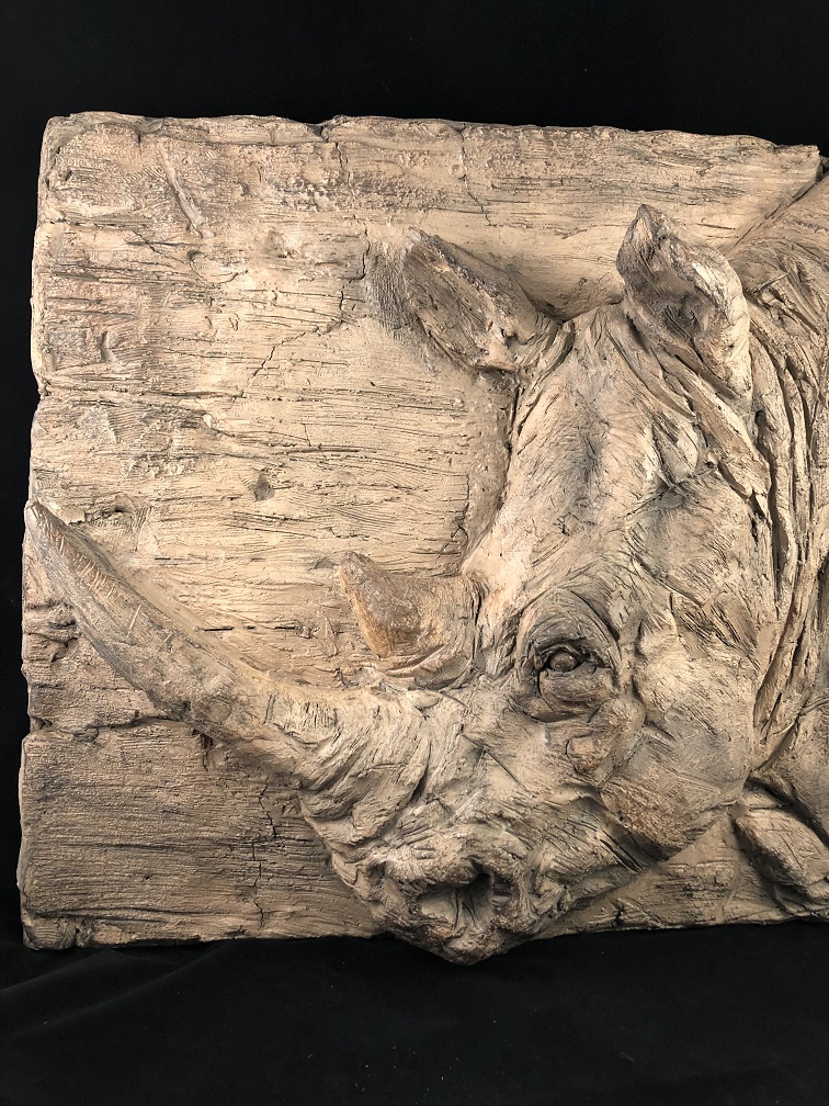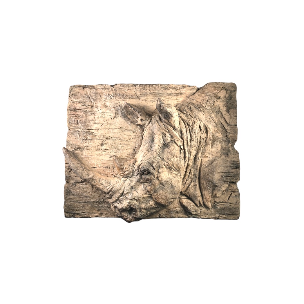 Wandornament woodlook met 3 D afbeelding van een neushoorn, polystone-wood.