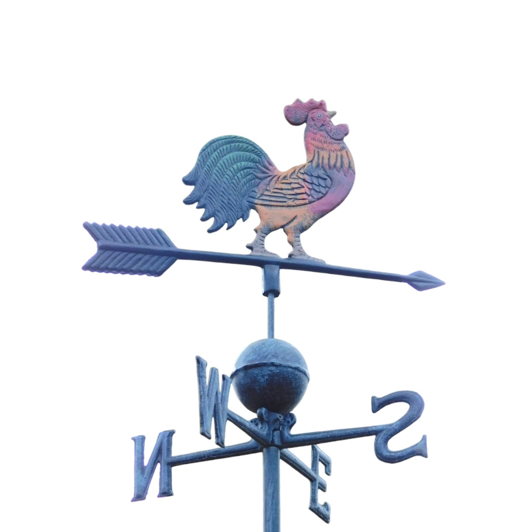 Deze opvallende windhaan met tuinsteker heeft een indrukwekkende totale hoogte van 183 cm, waardoor hij direct in het oog springt. Het is een prachtige blikvanger voor in de tuin of op het terras.