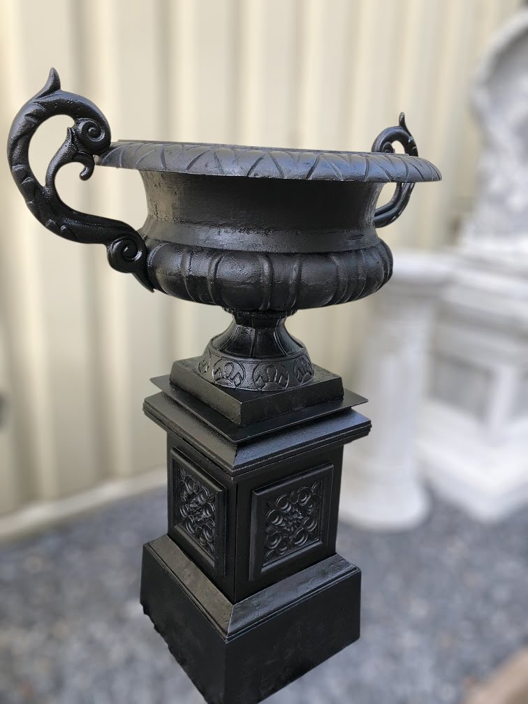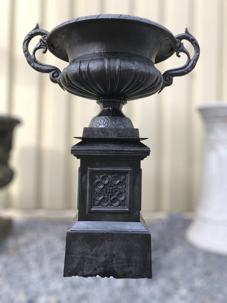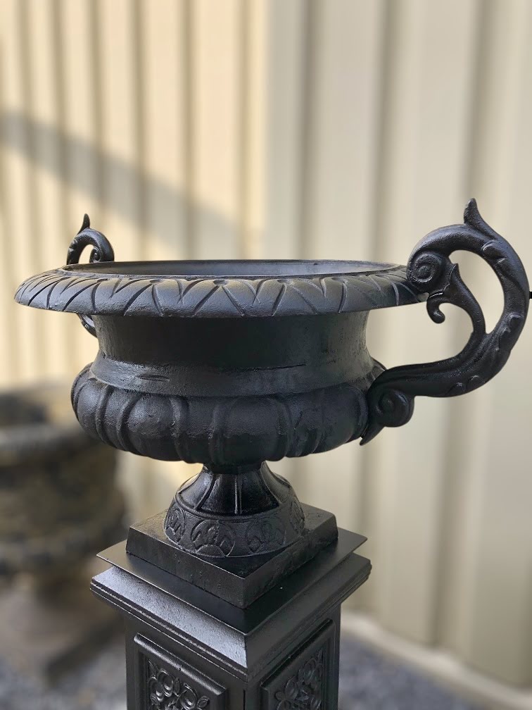 Een grote, exclusieve tuinvaas met sokkel, volledig vervaardigd uit gietijzer in een klassieke stijl. De zwarte afwerking geeft deze set een tijdloze uitstraling en maakt het tot een echte blikvanger voor tuin, terras of oprit.