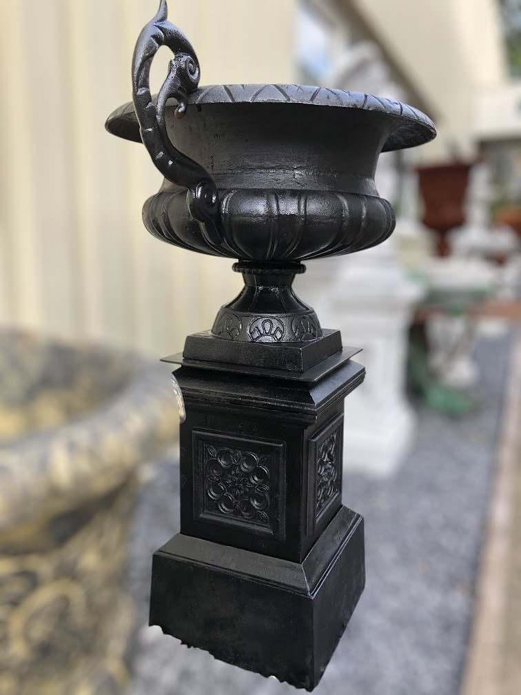 Gietijzeren tuinvaas op sokkel, 110 cm hoog, in klassiek zwarte uitvoering.