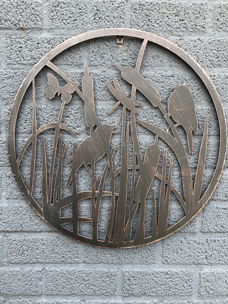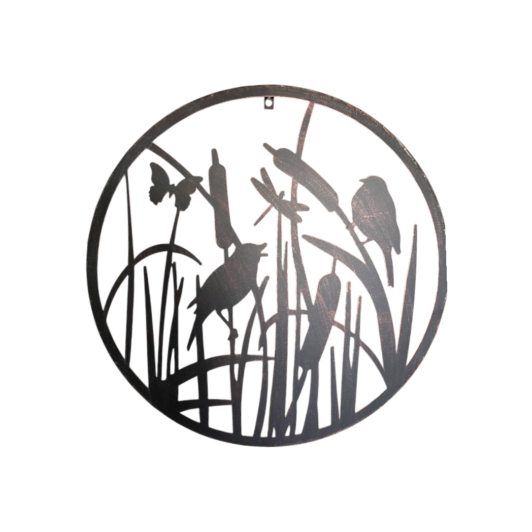 Leveringsomvang: 1 x rond metalen wandornament 'Vogels in Riet', zwart-koperen afwerking.