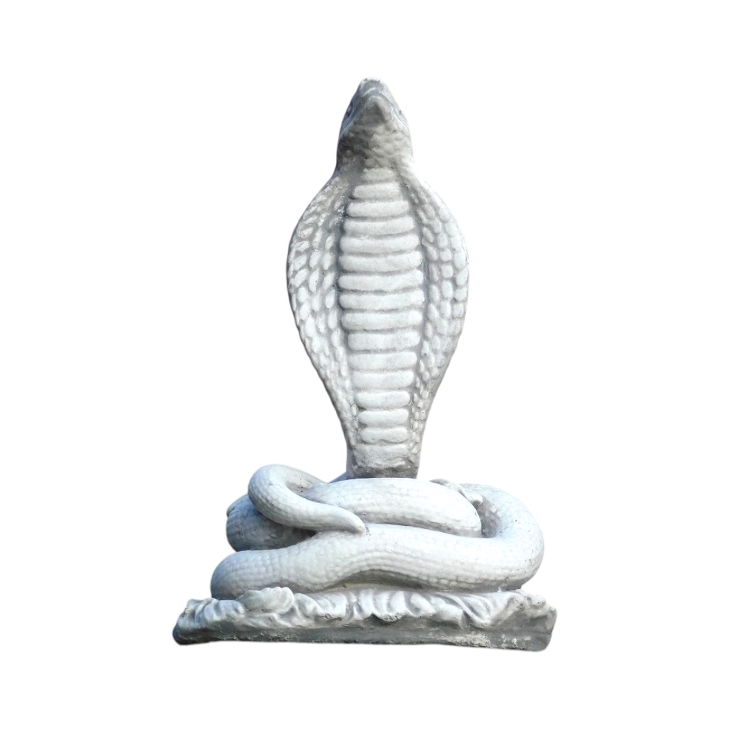 Ervaar de mystiek van onze stenen cobra sculptuur, een intrigerend beeld dat zowel binnen als buiten tot zijn recht komt.
