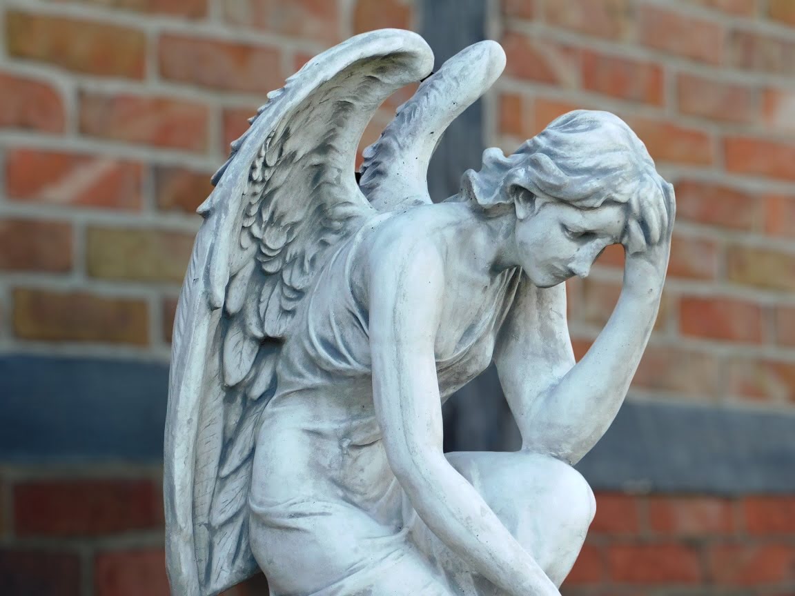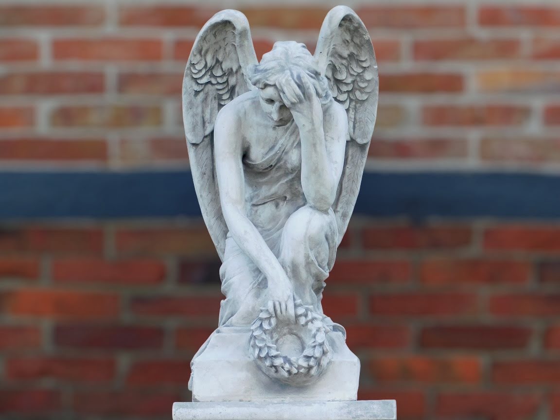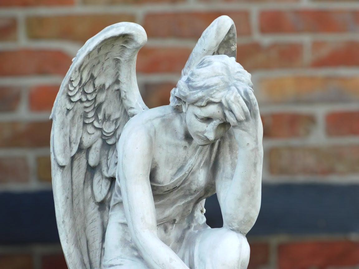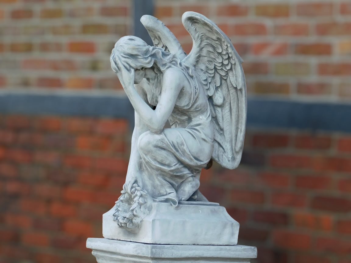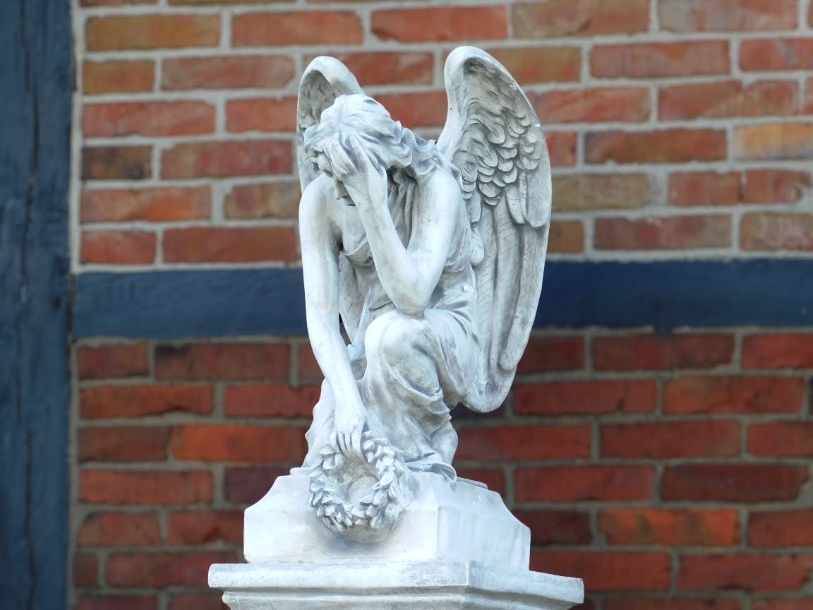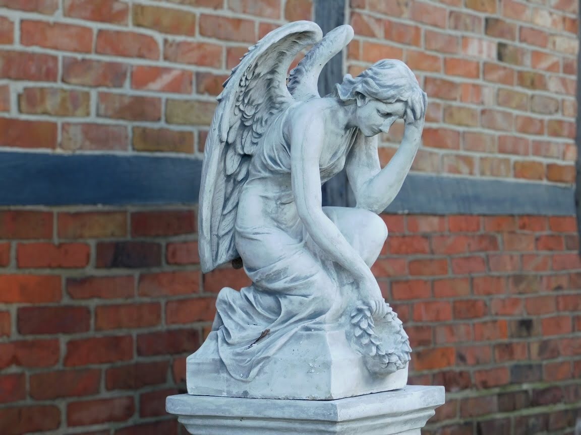 Groot tuinbeeld van een engel: imposant engelenbeeld van steen, in knielende houding.