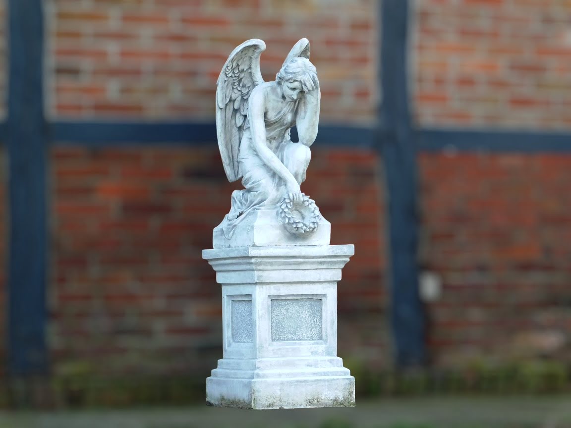 Laat je betoveren door de majestueuze schoonheid van deze knielende engel, met haar sierlijke vleugels en een krans liefdevol in haar hand. Dit indrukwekkende beeld, geplaatst op een stevige vierkante sokkel, is een betekenisvolle toevoeging aan elke ruimte.
