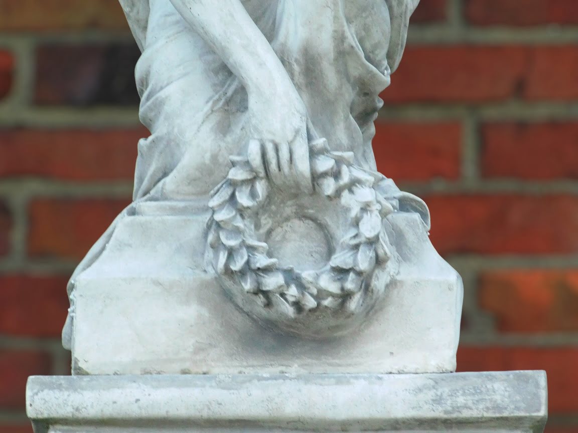 Leveringsomvang: beeld engel met krans + sokkel, steen.