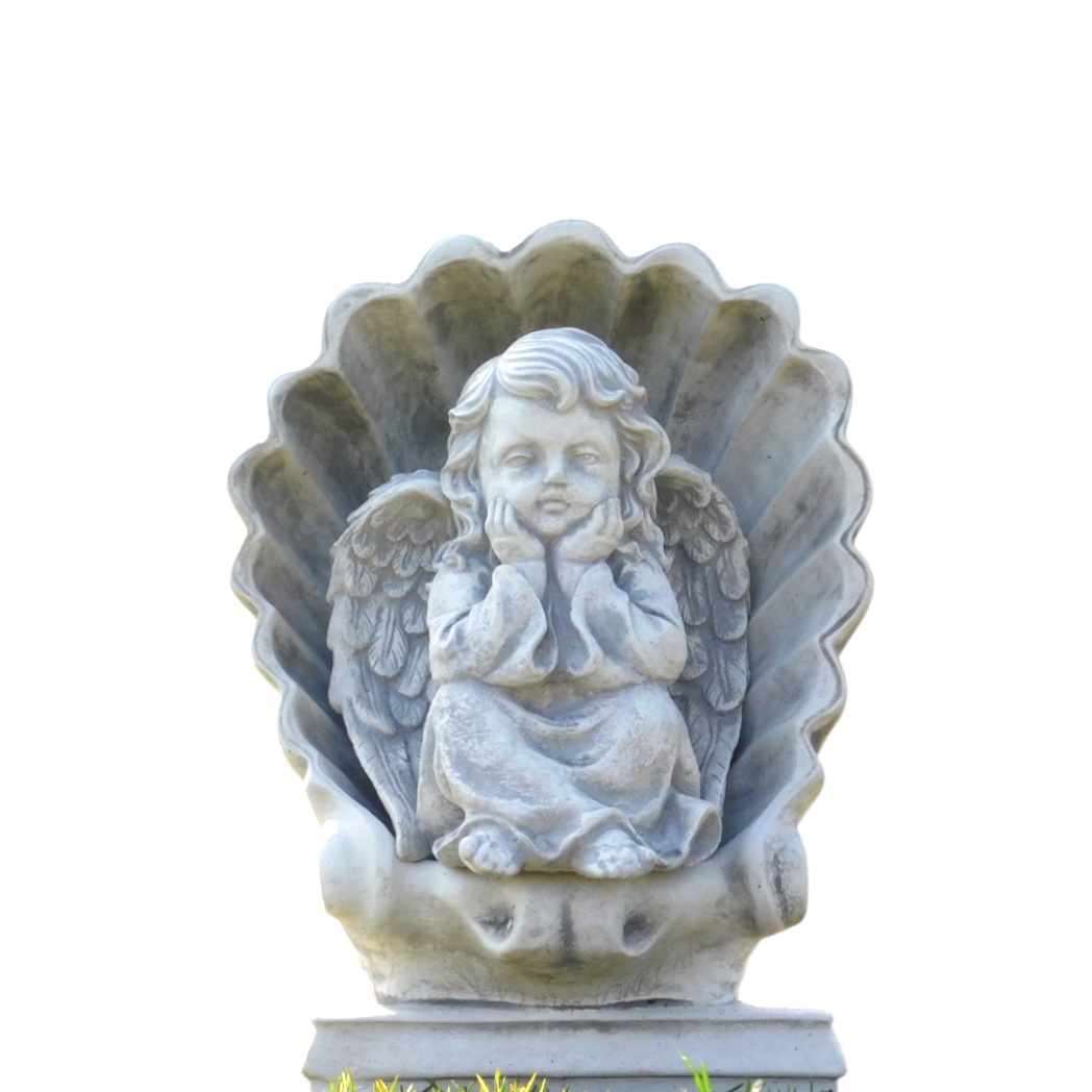 Zittende engel in schelp - stenen beeld - 40 cm - op voet.