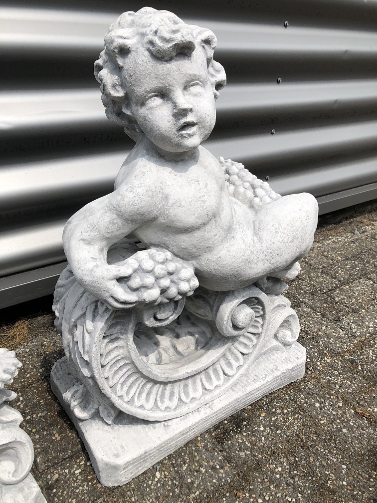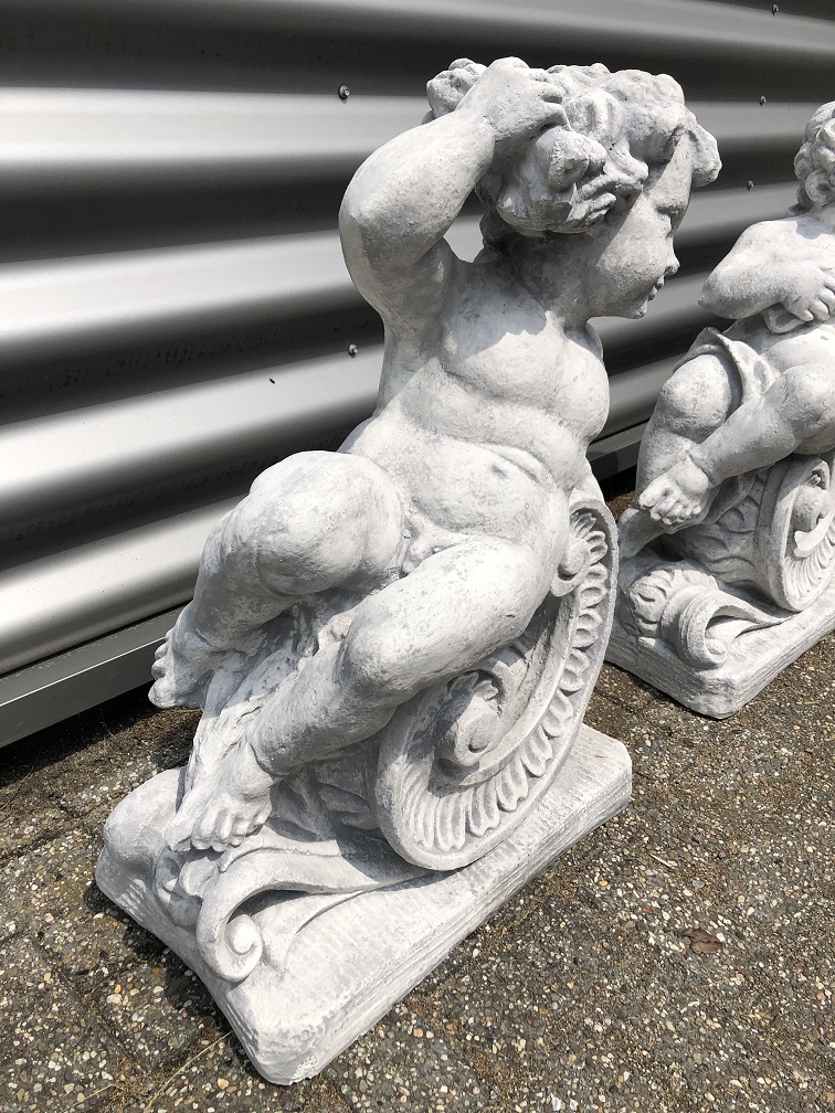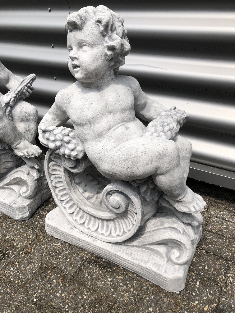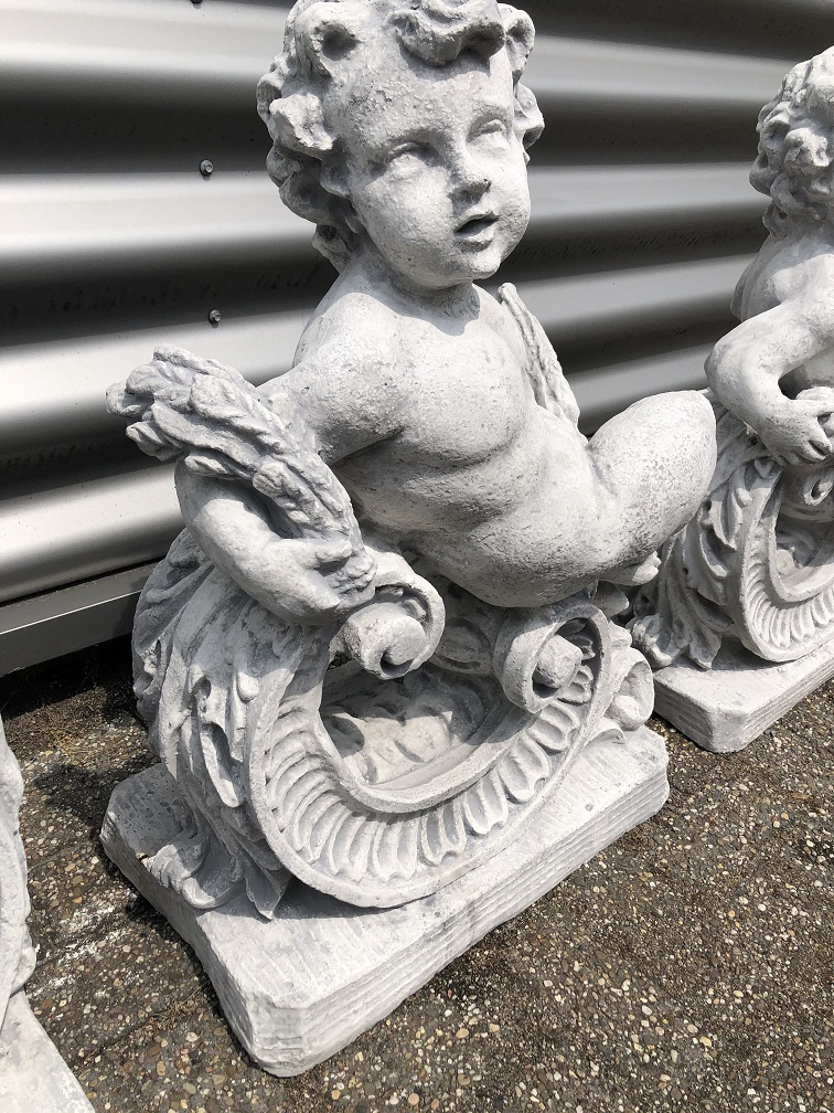 Deze prachtige set van vier engelen, elk symbool voor één van de jaargetijden, is vervaardigd uit composiet gietsteen. De beelden representeren de godinnen Flora (lente), Ceres (zomer), Pomona (herfst) en Vesta (winter), en zijn herkenbaar aan hun kenmerkende attributen: een uitbottende tak, korenaren, een druiventros en een vuurpot. De engelen delen een vergelijkbare lichaamshouding, wat zorgt voor een harmonieuze en evenwichtige uitstraling.