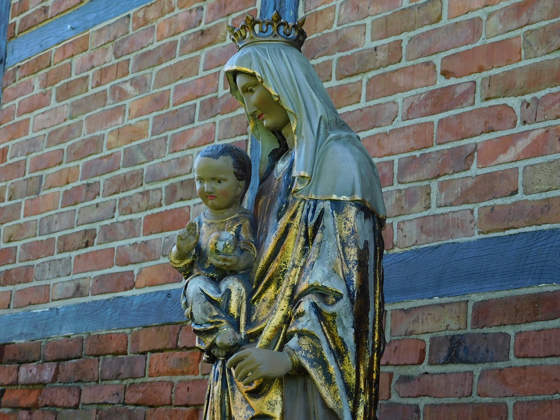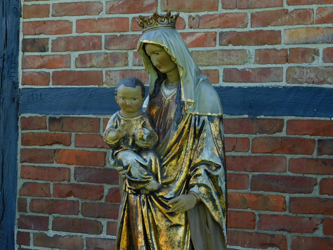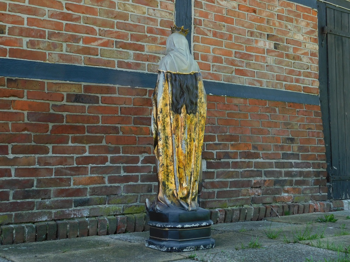 Het beeld is vervaardigd uit polystone, een materiaal met de uitstraling van natuursteen, maar lichter en weerbestendig. De verfijnde details en de authentieke old-look afwerking geven het een tijdloos karakter, perfect als serene blikvanger in een tuin, kapel of interieur.