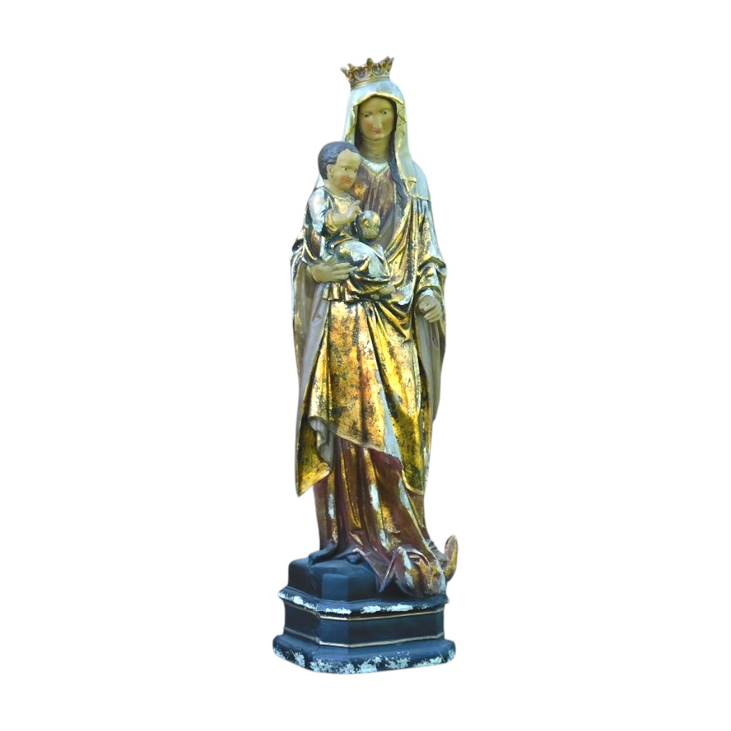 Dit imposante beeld van Maria met Jezus in haar armen straalt rust, liefde en spiritualiteit uit. Met een hoogte van circa 130 cm vormt het een indrukwekkend en betekenisvol kunstwerk voor zowel binnen als buiten.
