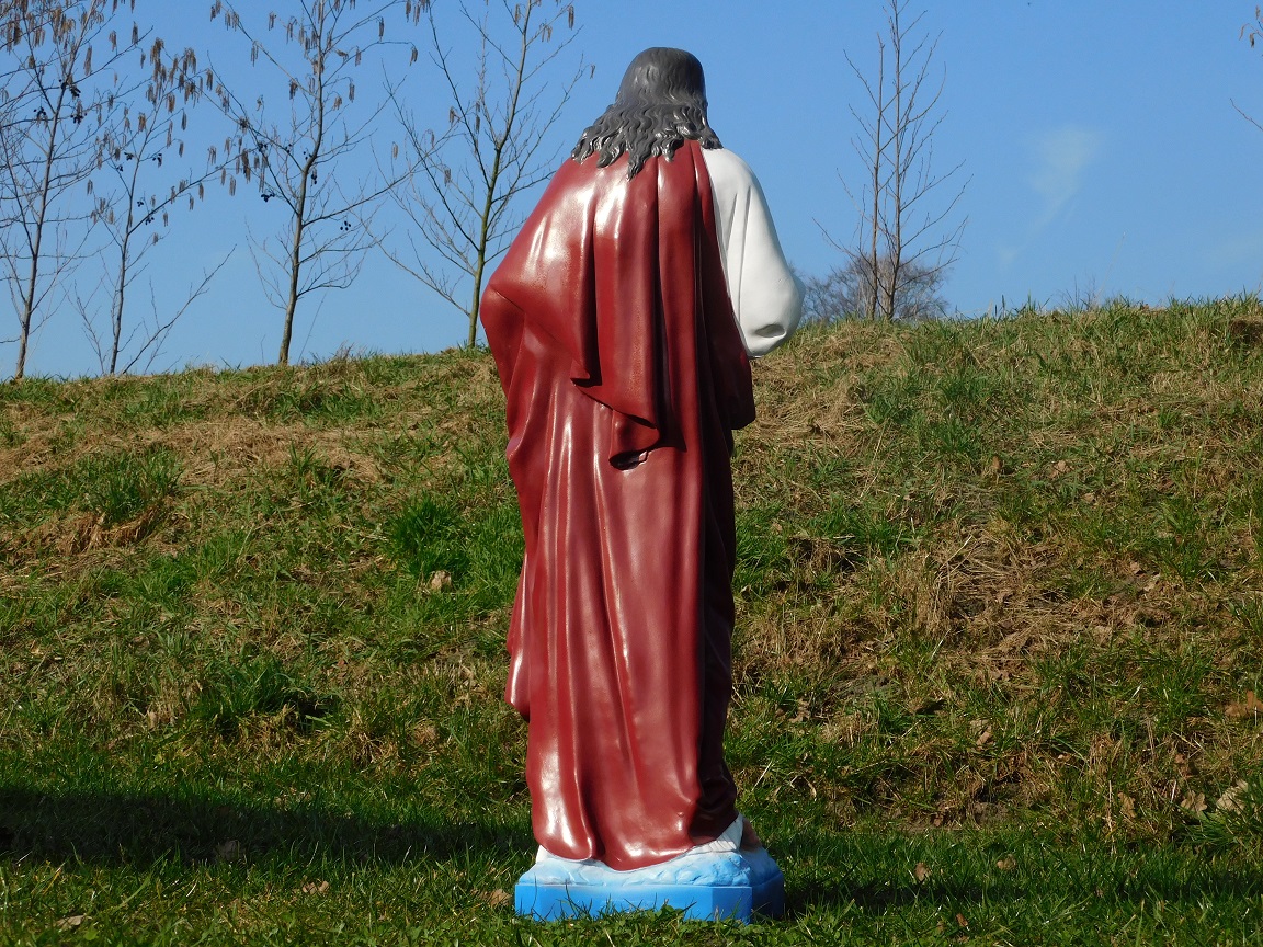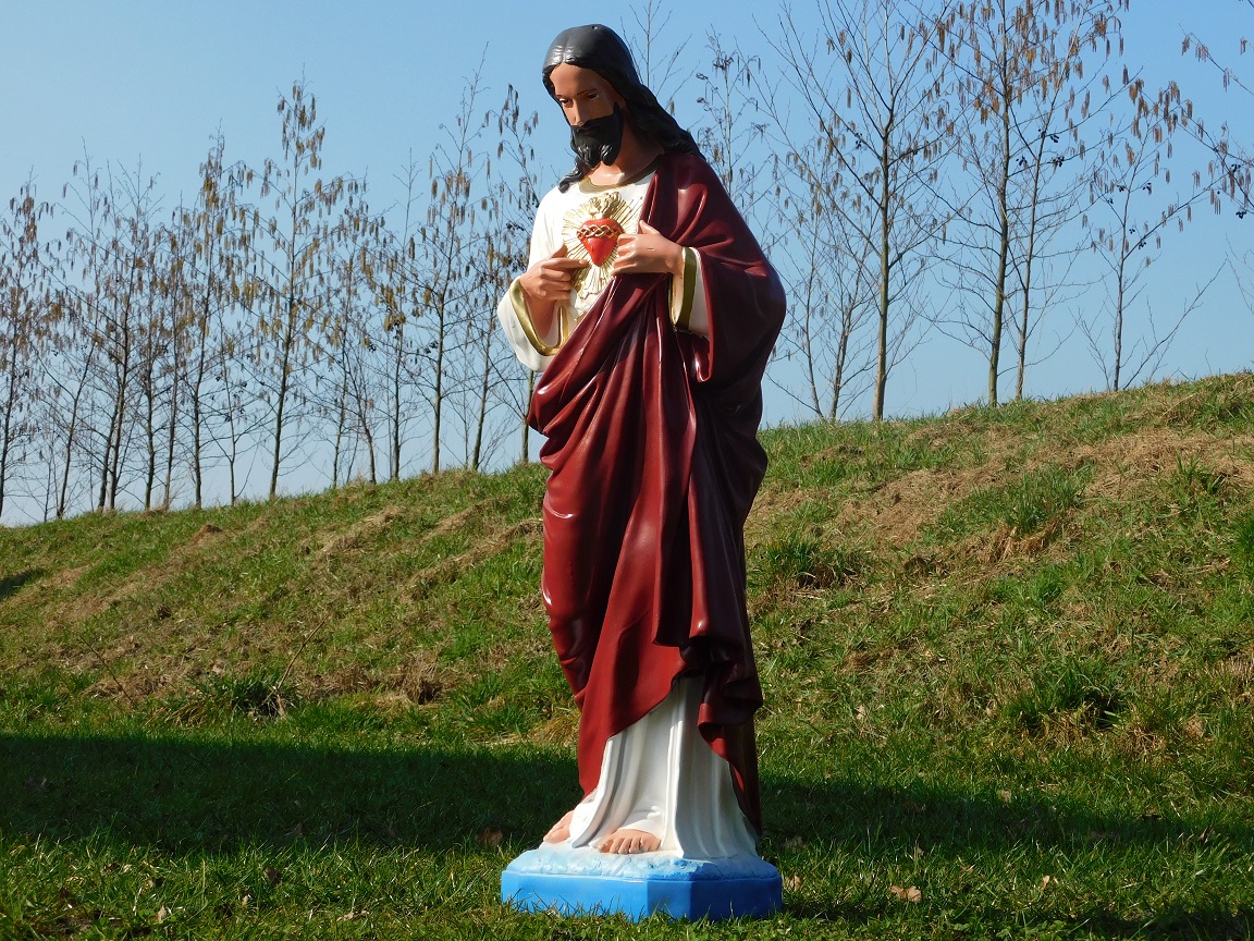 Exclusief standbeeld van een Heilig Hart Jezus figuur, uniek in kleur en detail, gemaakt van hoogwaardig kunststof (polystone).