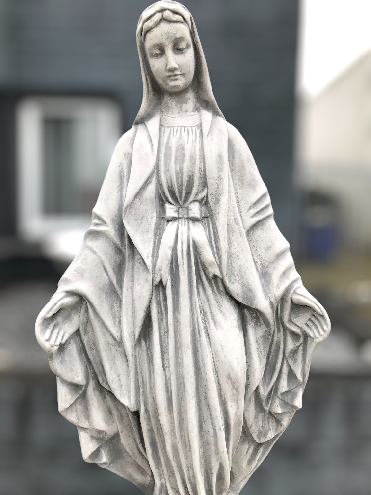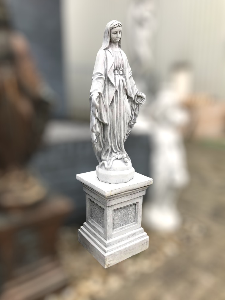 Tuinbeeld Maria op sokkel, gemaakt van steen: een exclusieve grote set als imposant standbeeld in de tuin.