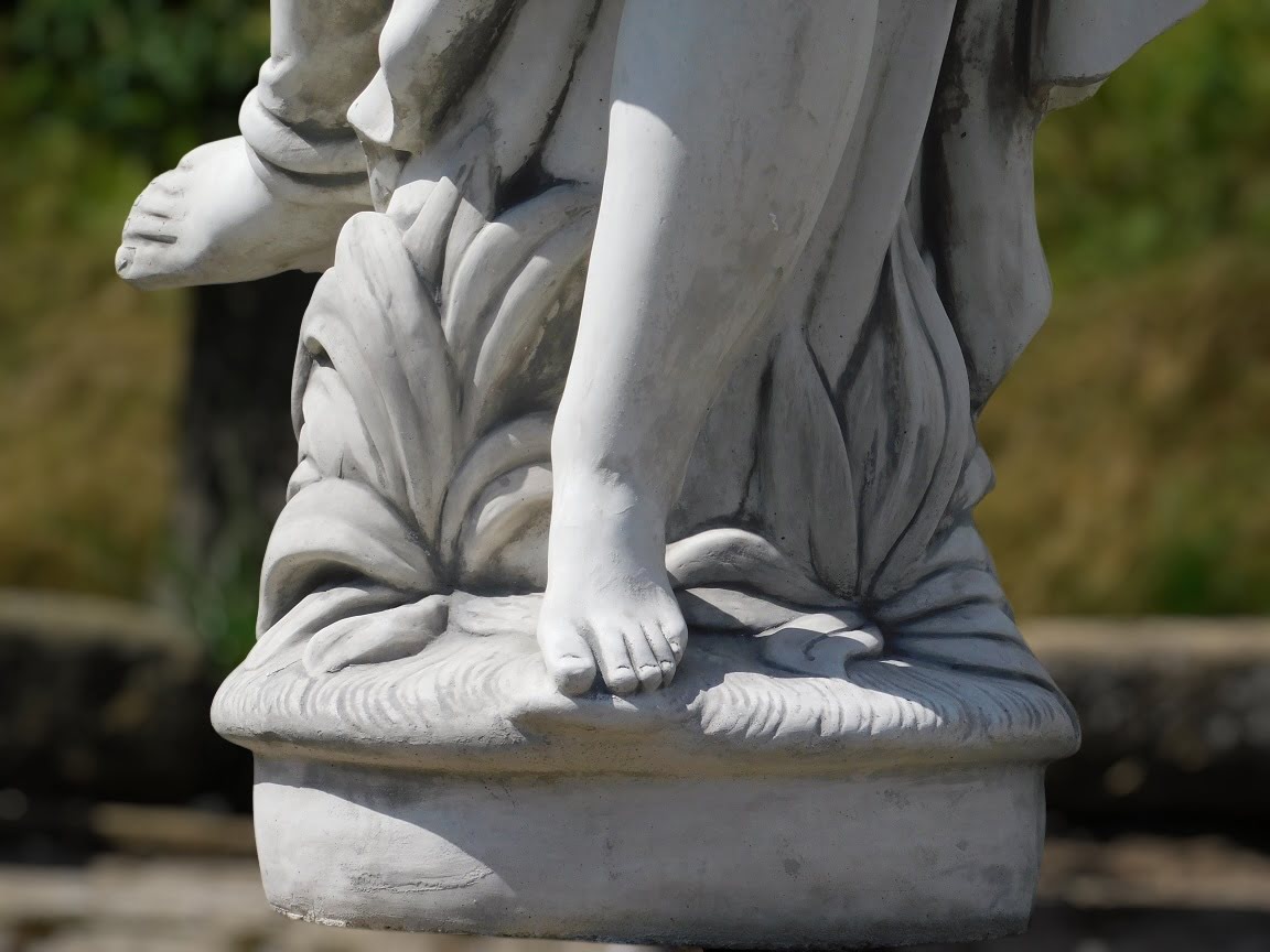 Een imposant tuinbeeld van een sierlijke dame, uitgevoerd in massief steen – een verfijnde blikvanger voor elke buitenruimte.