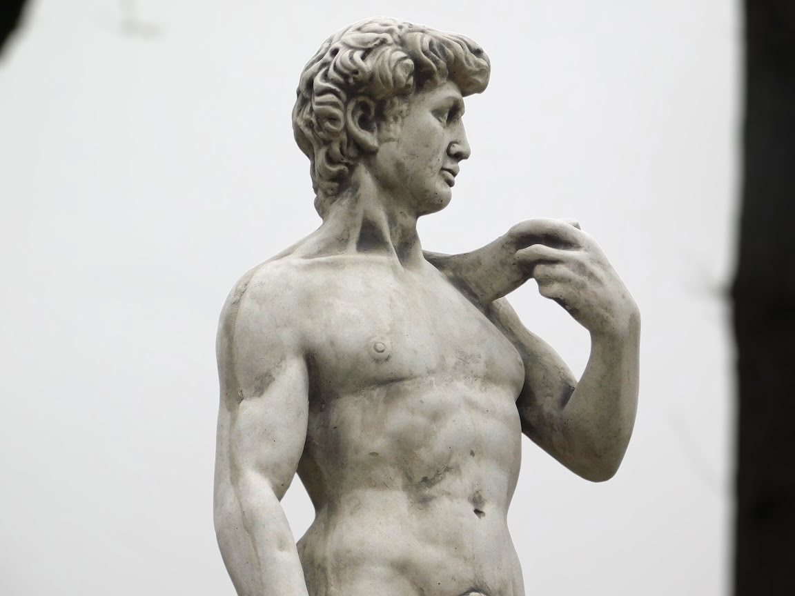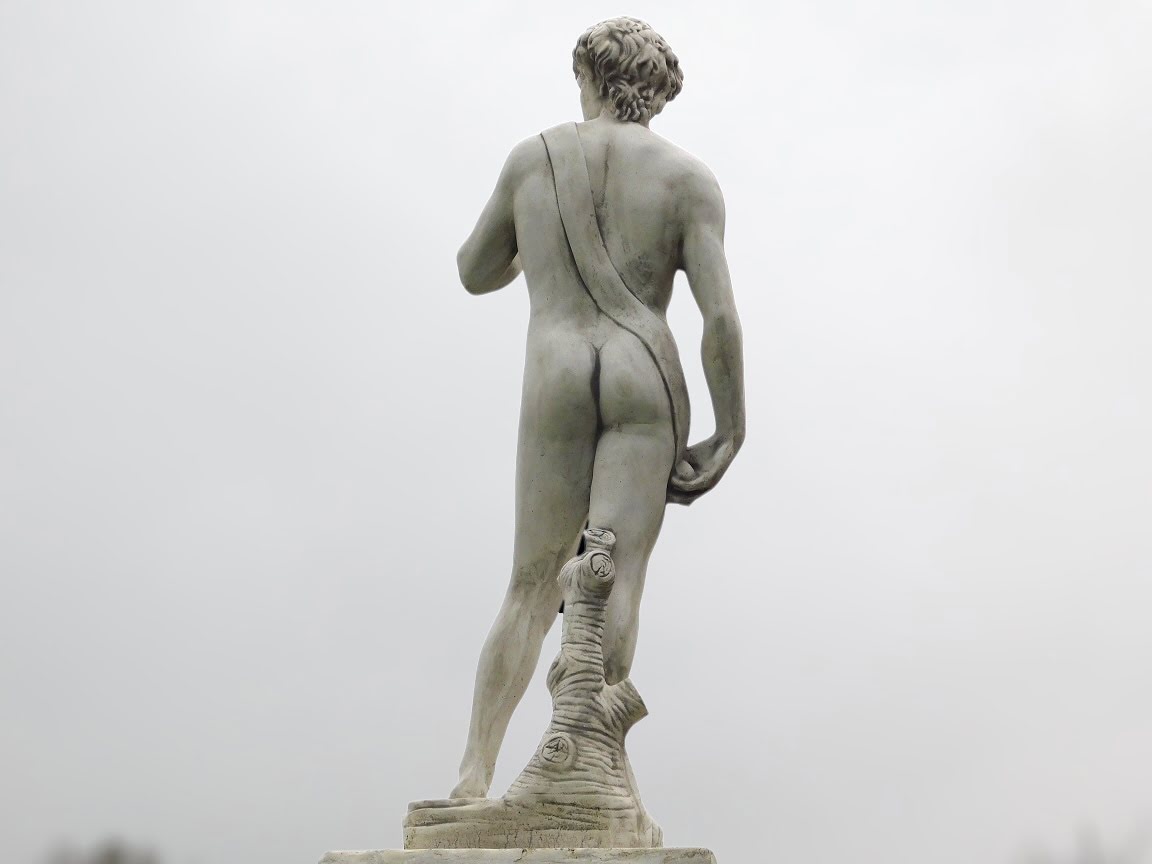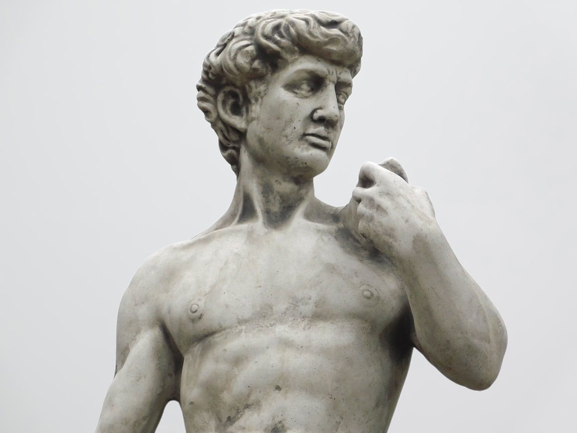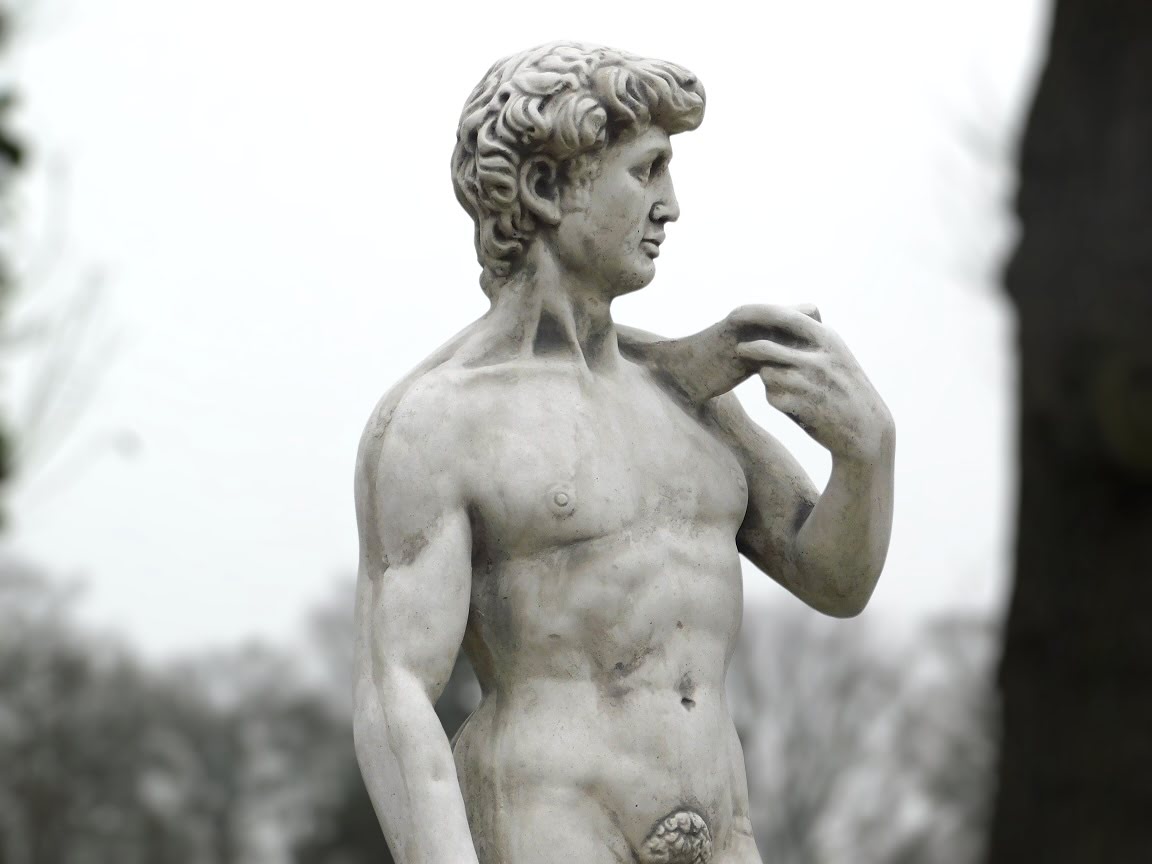 Standbeeld David van Michelangelo: een groot tuinbeeld van een een Bijbels figuur, gemaakt van steen.