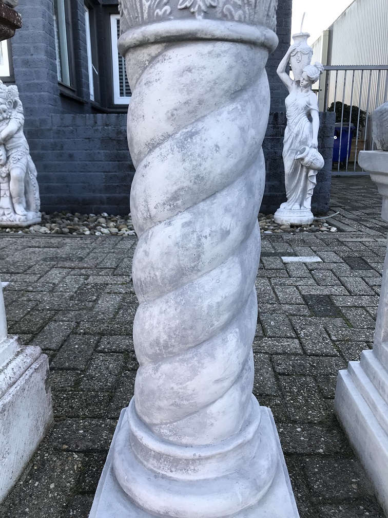 Een elegante stenen zuil met subtiele draaiing, geïnspireerd op klassieke ontwerpen. Met een hoogte van circa 96,5 cm en een sierlijk gedraaide vorm is deze sokkel ideaal om een beeld, vaas of decoratief object stijlvol te presenteren.