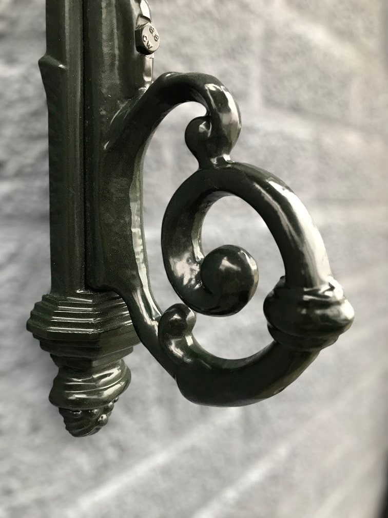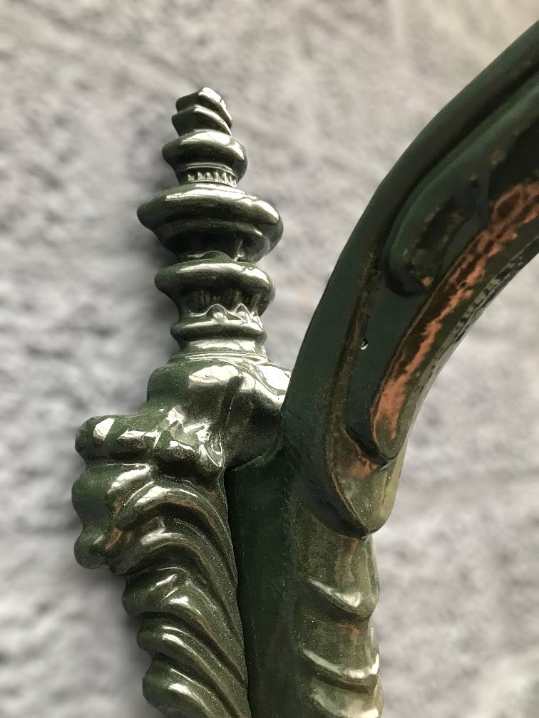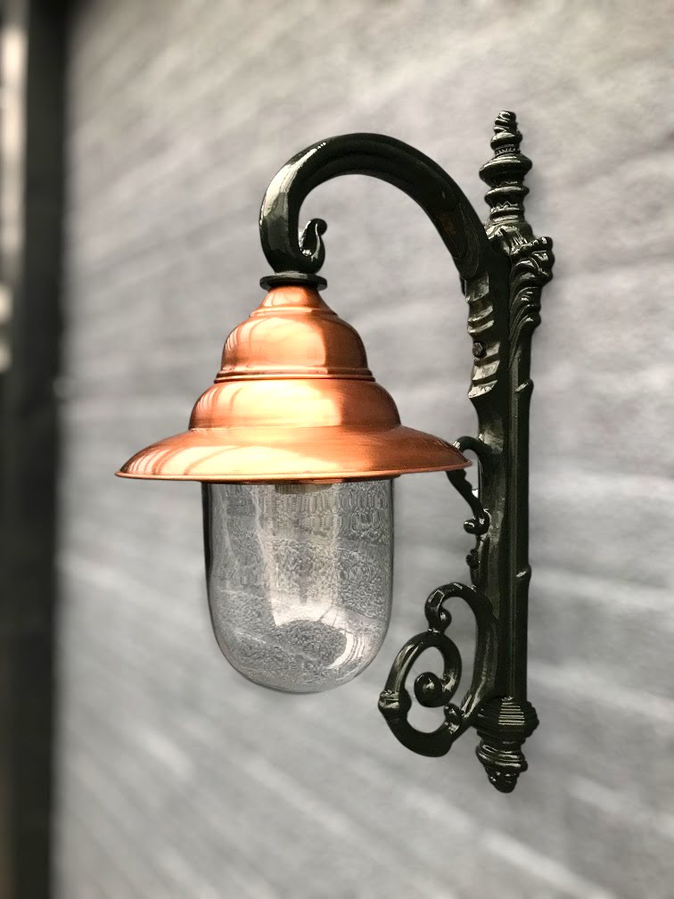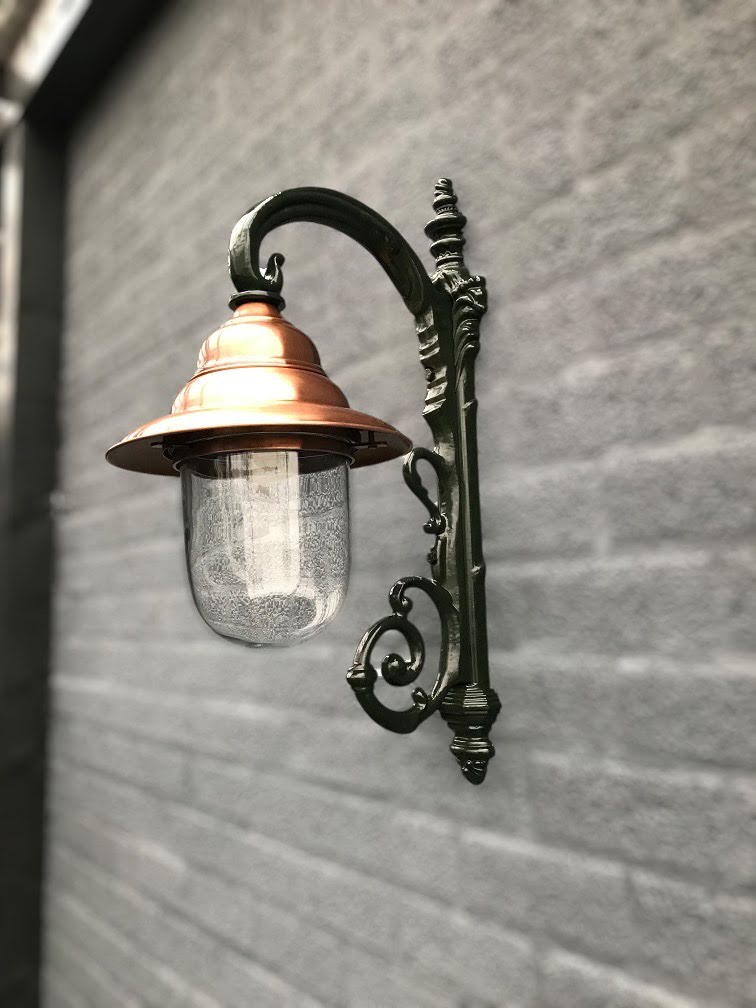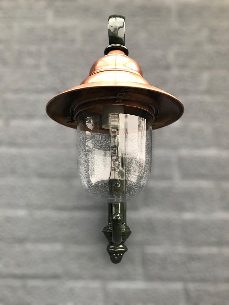 Klassieke wandlamp van groen aluminium met koperen kap, buitenverlichting in exclusieve Franse stijl!