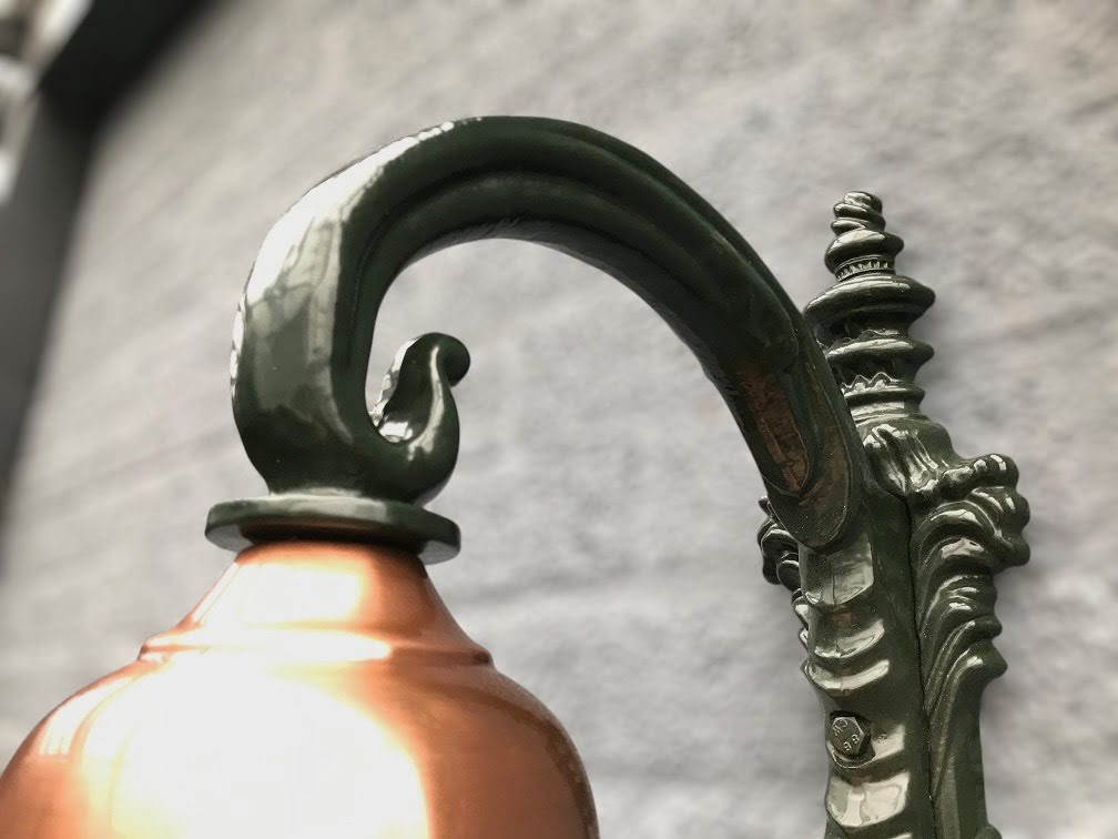 Een karaktervolle nostalgische wandlamp in groene uitvoering met een echte koperen kap. Deze stijlvolle buitenlamp is ontworpen naar antiek voorbeeld en vormt een bijzondere toevoeging aan tuin, gevel of entree. De combinatie van het groene armatuur en de warme koperen kap zorgt voor een luxe en authentieke uitstraling.